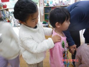 年長さんが年少・中さんへ優しく声を掛けたり、