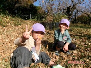 子どもたちは外へ行き、鬼ごっこや鉄棒、落ち葉を使ってお家ごっこ…